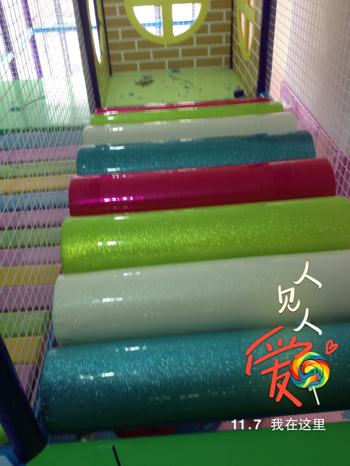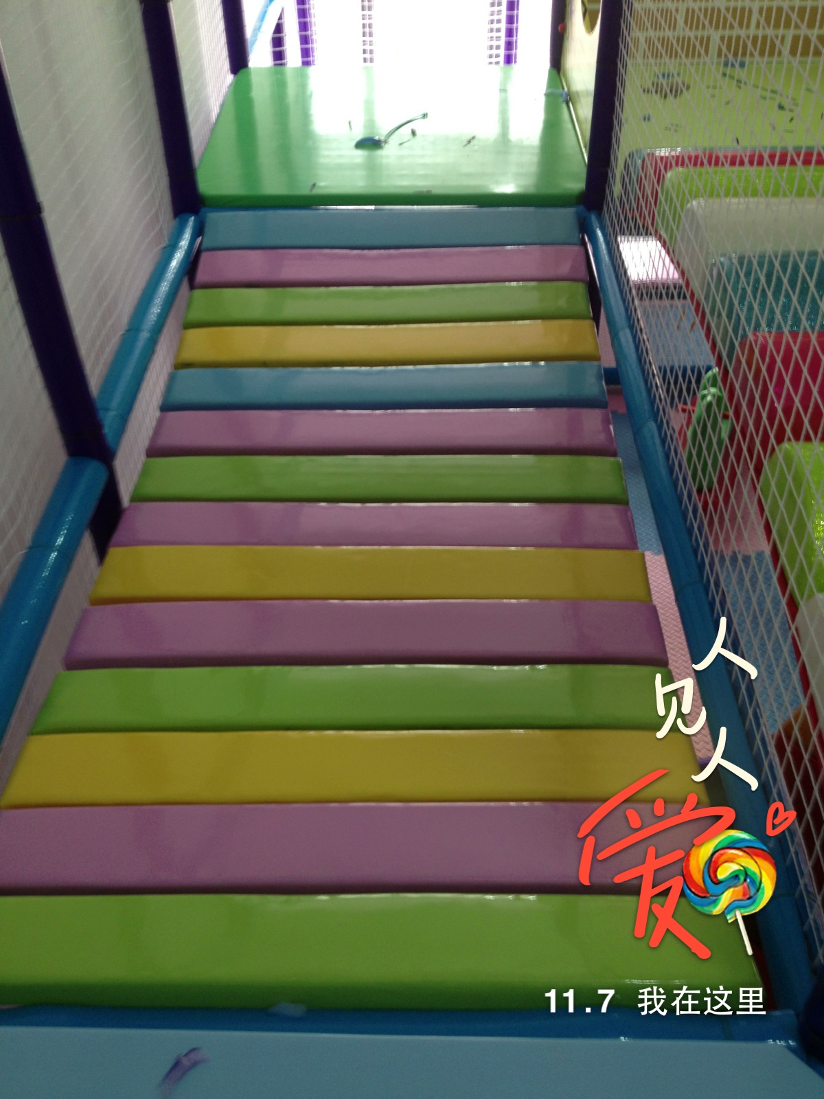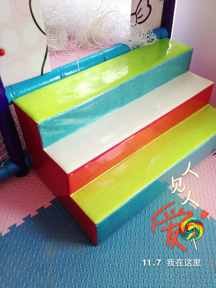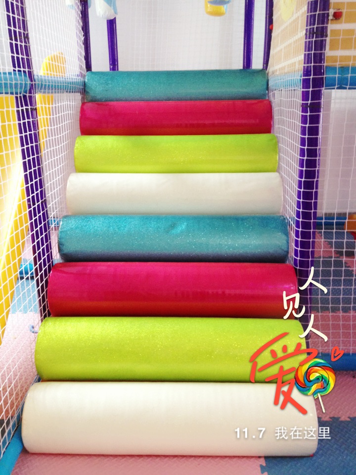3、彩虹天梯:内部为木制,中间包重泡海绵(符合GB6675-2003标准),最外层包一层进口超强PVC经纬编织闪光革,强度高,安全性能优良,安装时倾角小于30度,符合国家标准。